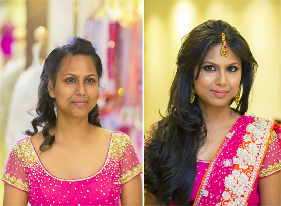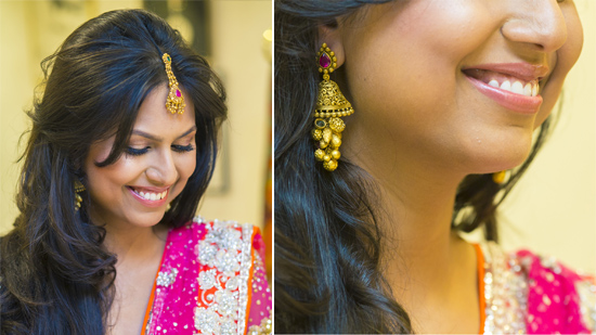 It was one thing to wear the bridal ensemble and accessories, and another to look like one. Ojas, being the amazing makeup artist that she is, used just the right amount of makeup from Inglot to give me a wow look. Starting with a base for my face, she first did my eyes. She applied an eye make-up base, and on the eyelid she applied a mix of different eye shadows to contour my eyes and accentuate the eye shape. Then, she applied kohl on the inner and outer rim of the eye and finished by using fake lashes, and running a liquid black liner on the lash line to make it look more natural. For my lips, she used a natural skin color liner and a soft pink lipstick over it, and finished by adding gloss for a mirror shine effect. I was thrilled once I saw my final look. I felt so beautiful, happy and confident!