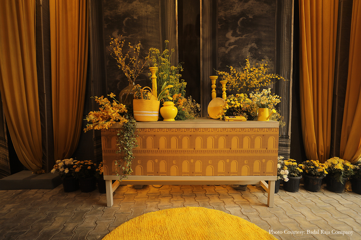 The traditional ceremony of Bhaat was hosted at the chic venue of The Studios in Andaz Delhi. The vibrant yellow floral decor with sunflowers lit up the modern design of the space, making for an elegant affair with traditional rituals, a delectable brunch spread, and live music.