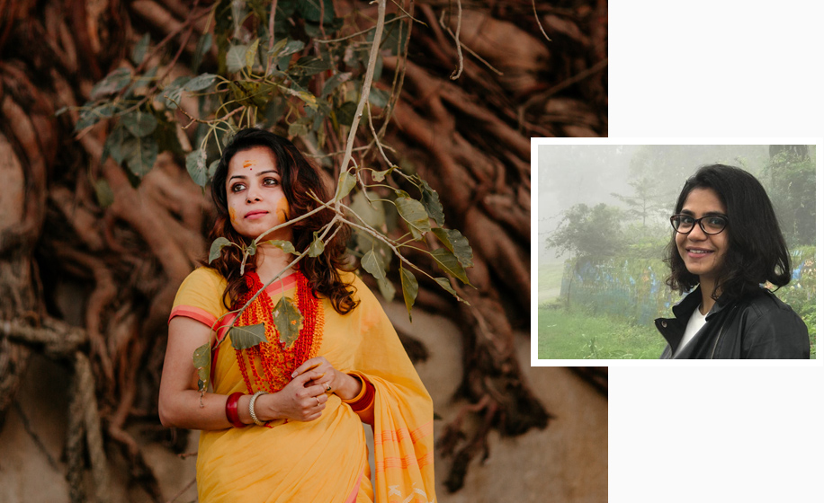 In the streets of Kolkata, Bride Tania’s hands are adorned with bangles made of shells soaked in turmeric water as a part of the Dodhi Mangal ceremony during the Bengali wedding. The bride’s simple yet stunning look makes this photo a special one.