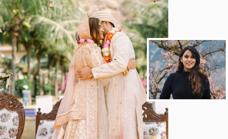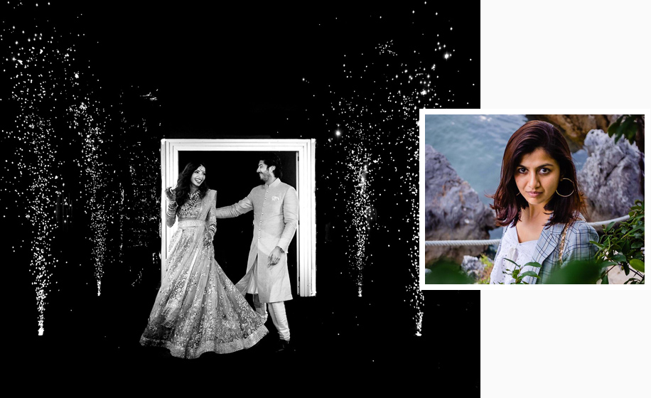 This photo may be black and white, but one can almost feel the spectrum of colors in this shot – the glitter of the fireworks that look like clusters of stars in the darkness, the sunny smile of bride Antara, the cool vibe of groom Mohit Marwah, and the elegance of the charming frame behind them.
