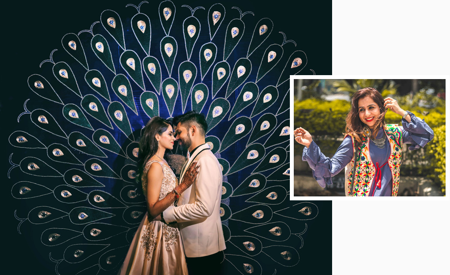 The exquisite peacock feathers backdrop of the setting adds a regal vibe to this image which shows a couple sharing a sweet moment by posing together. The contrast between the rich royal blue backdrop and the pastel shades of the couple’s ensembles makes for a compelling frame.