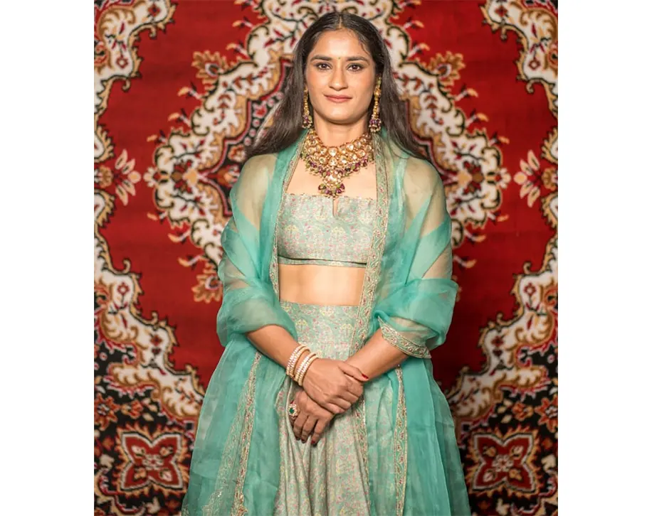 Designed by Ridhi Mehra, Vinesh’s sea green paisley print lehenga with an embellished organza dupatta is from the FEROJA collection. She accessoried her look with a necklace and earrings from Raabta by Rahul. Vinesh is engaged as well to long-term boyfriend and former national-level wrestler Somveer Rathee.