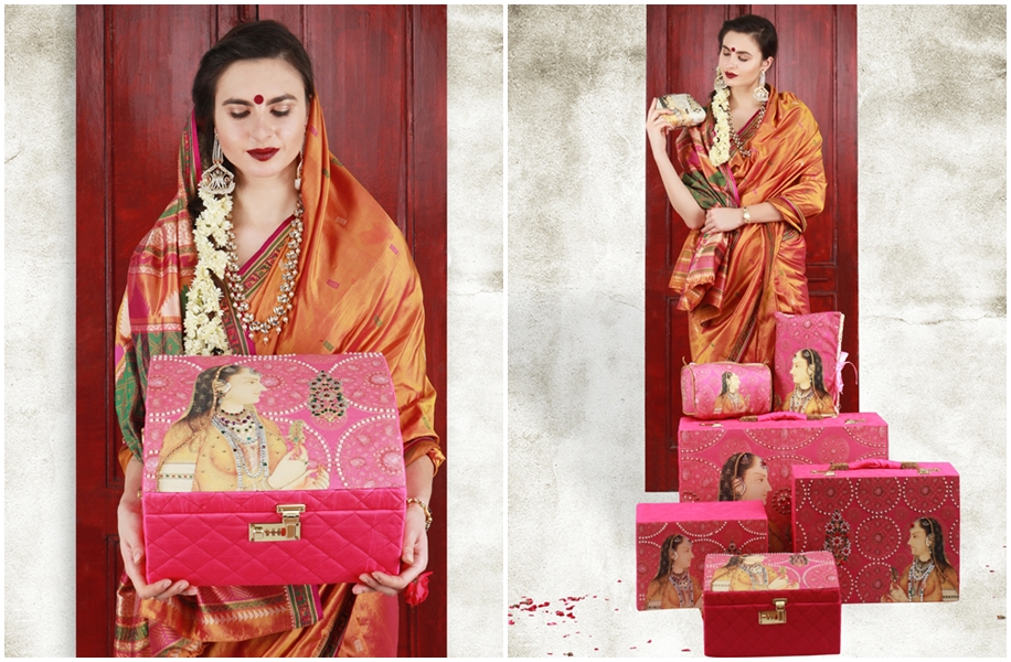“While bridal trousseaus have long been a part of Indian weddings, the trend of stylized trunks, which was initially just meant for the high-society brides, is catching on with everyone else too. Today all brides want to carry their belongings in style. A wedding is a celebration of a lifetime, where everything is larger than life from the clothes to the wedding decor, and the trousseau along with its presentation is as important as the things in it. Owing to the Indian tradition of pampering the brides, Puneet Gupta Fine Crafted Goods offers its trousseau collection of Mughal pop trousseau trunks, designer packing, clutches, and other fashion accessories.”