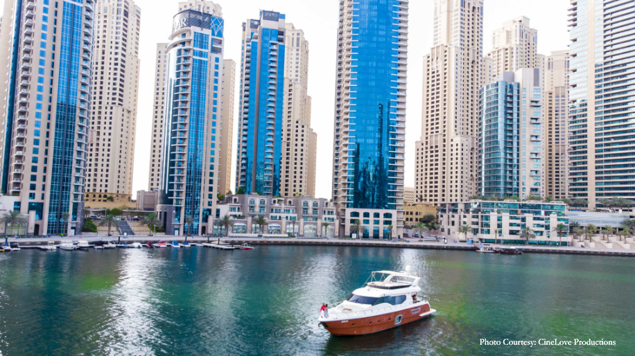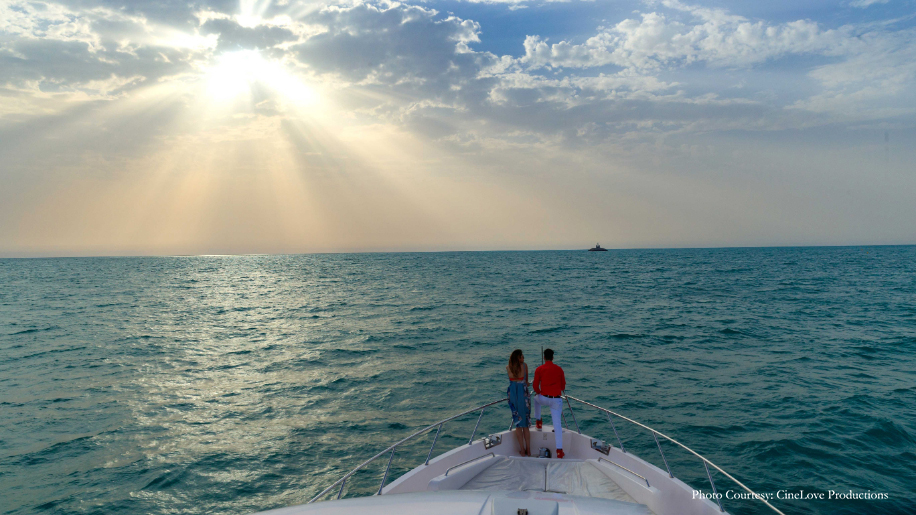 “Initially it felt a little awkward having a group of 8-10 people walking with us with cameras, but our team made Mayoor and Me very comfortable with the idea, and we started enjoying every moment from there on. We actually felt like celebrities! It’s impossible to choose the most fun part of the shoot as it was all a process and each moment was special. From the long car drive around the desert to cruising on the yacht, from walking around Madinat Jumeirah to our red carpet welcome at Shimmers Beach, every moment was bliss, and we didn’t want our pre-wedding shoot to wrap up when it drew to a close.”