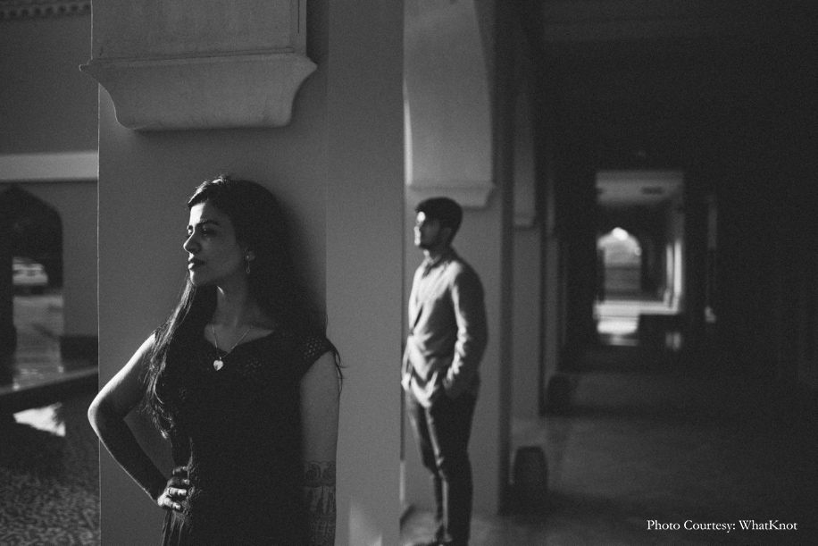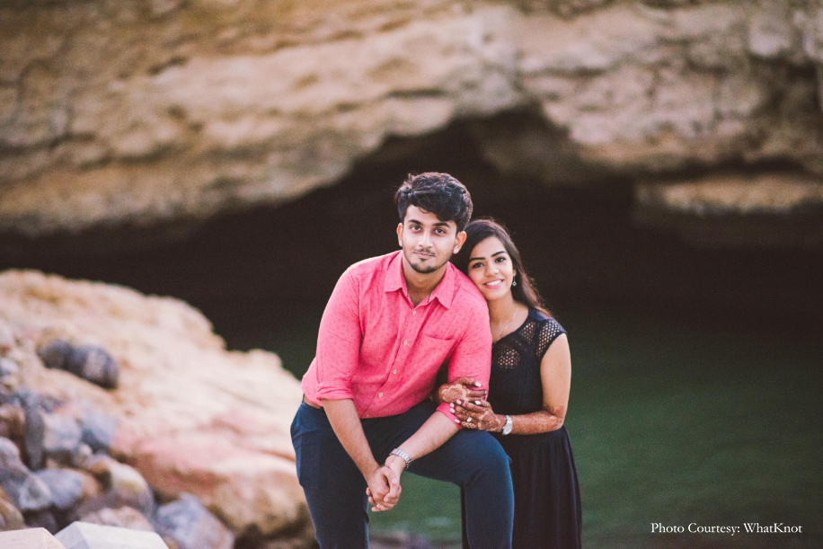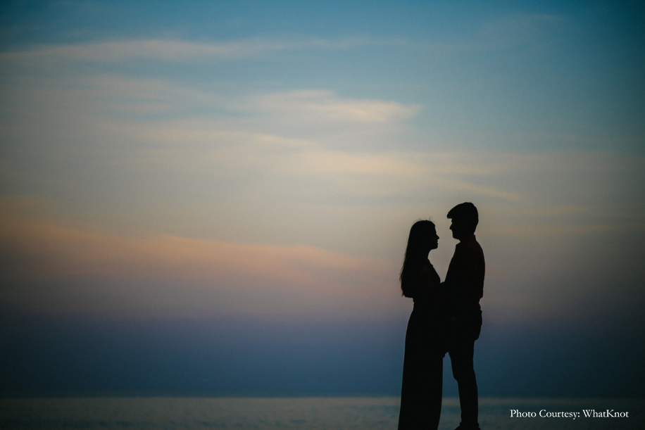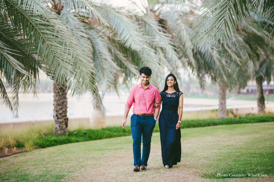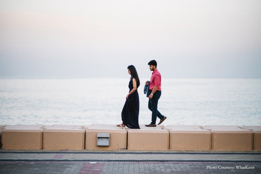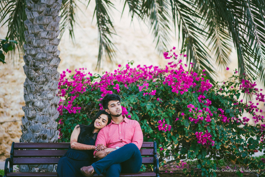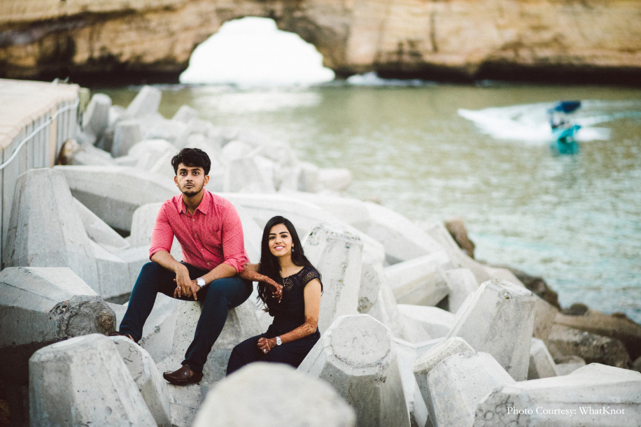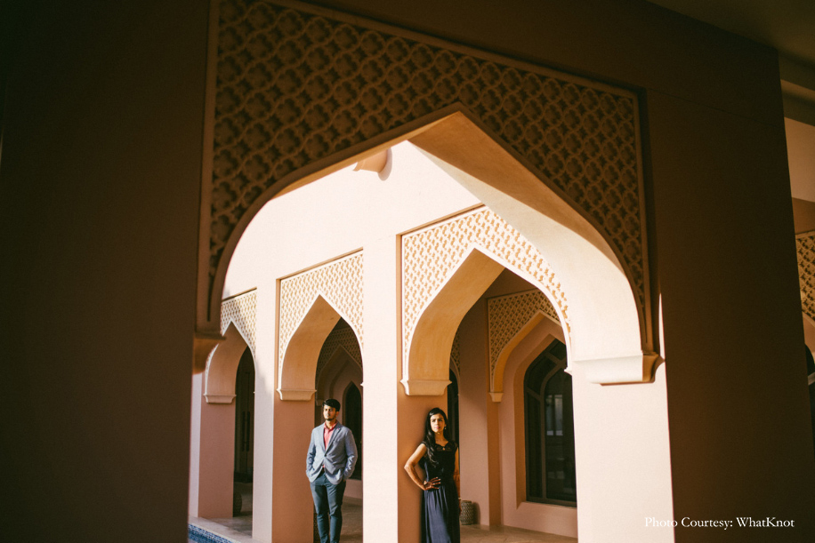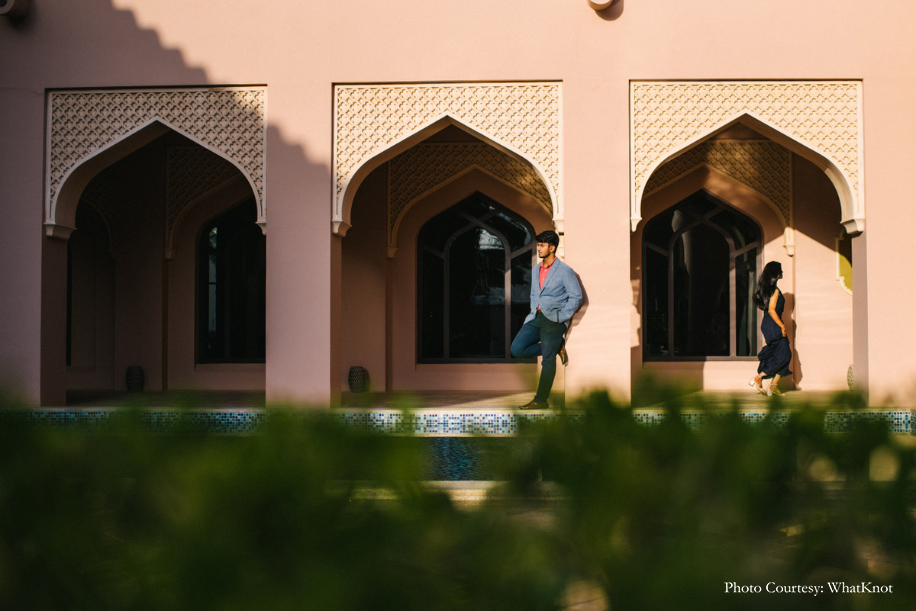The couple posed against traditional archways, in front of the calm waters of the gulf and on the lush gardens of the property. The WhatKnot team captured a series of images that fused sun rays, shadows and silhouettes in a compelling manner, thereby making this pre-wedding photo album a uniquely aesthetic one.