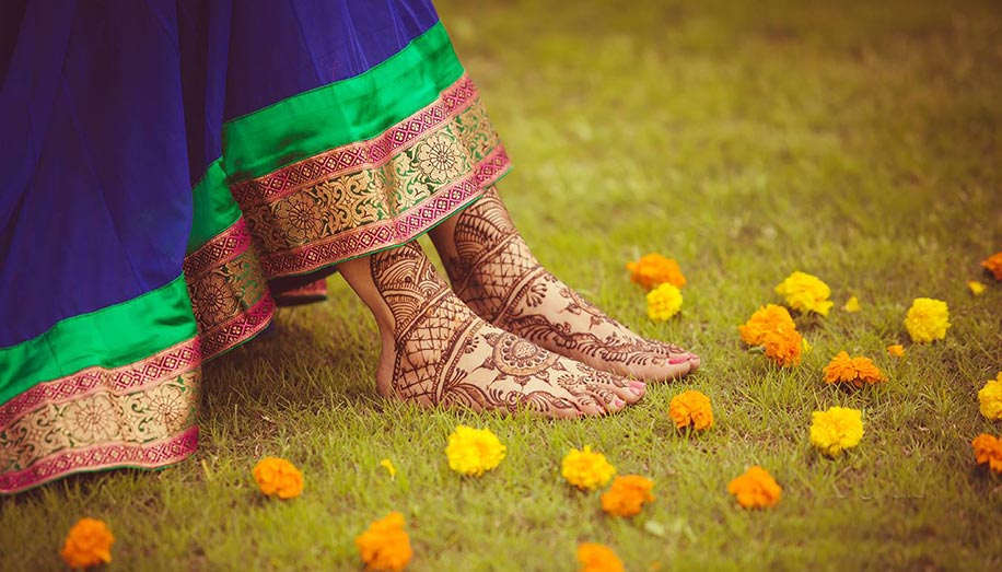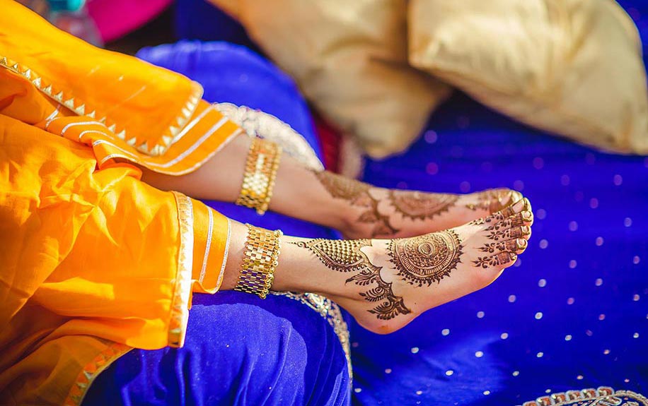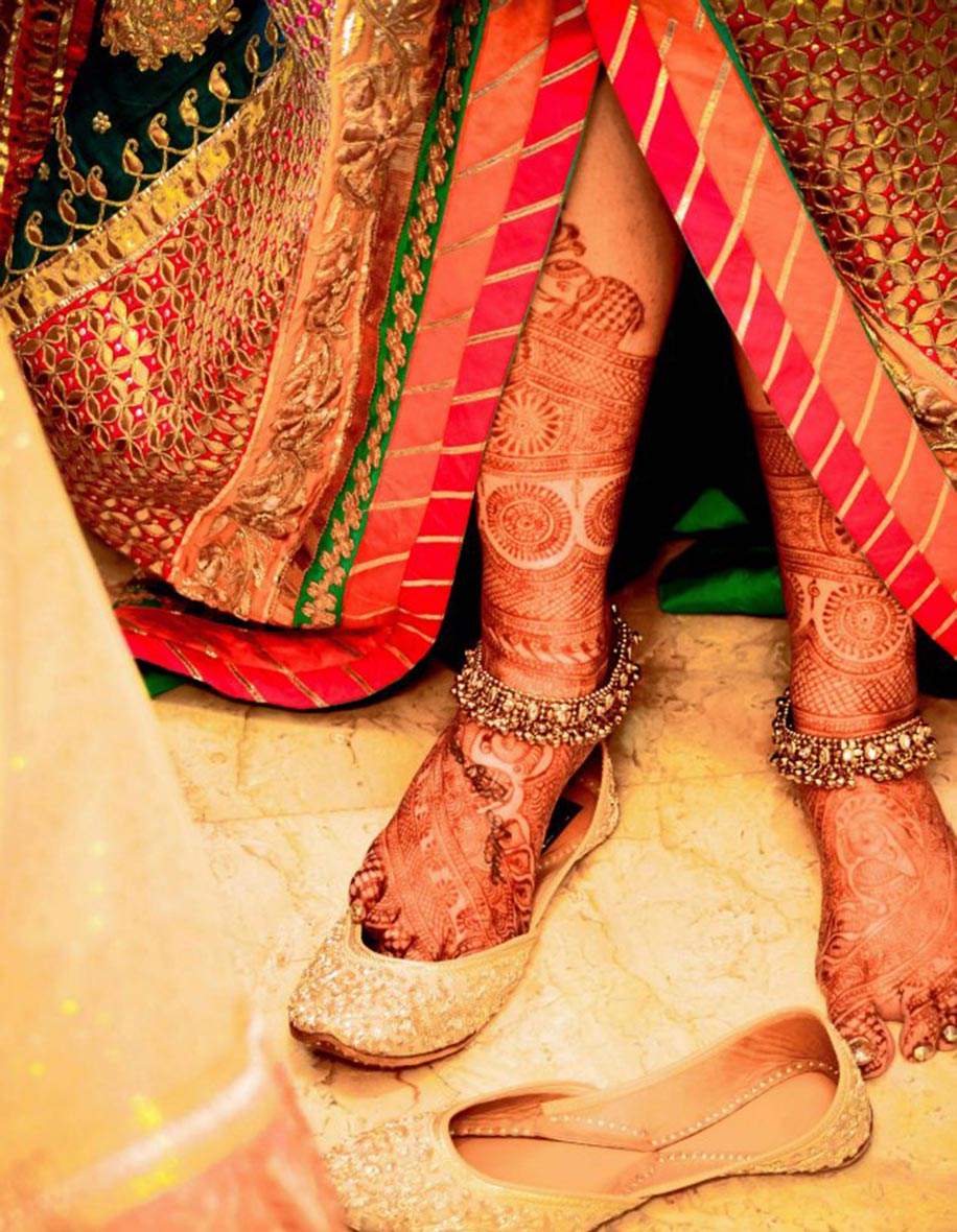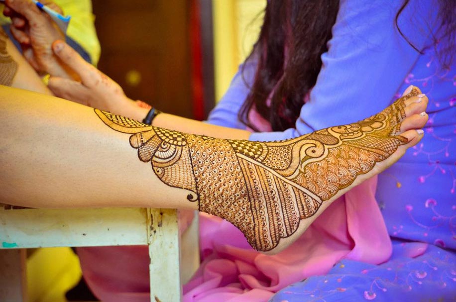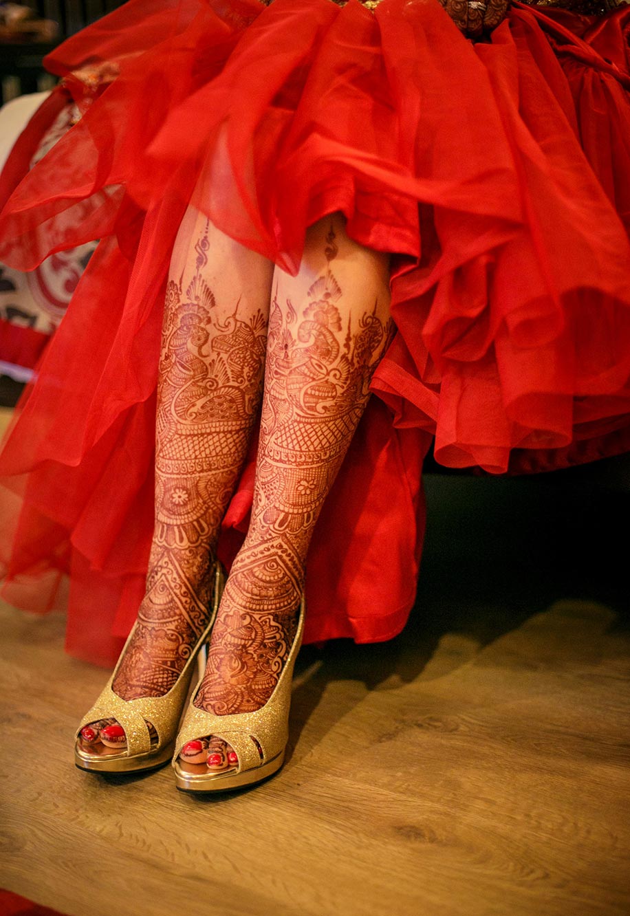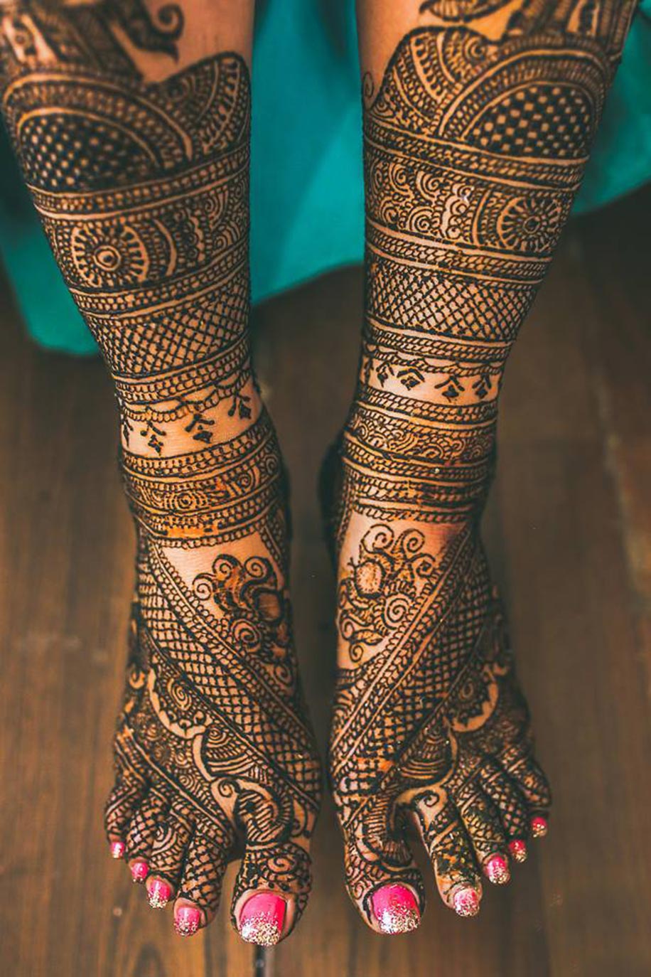 Want the world at your feet on your big day? Opt for modern mehndi patterns on your ankles, and go all the way up to the calves and knees if you want. You can even request for colourful accents that match your pedicured nails shade or bridal ensemble.
