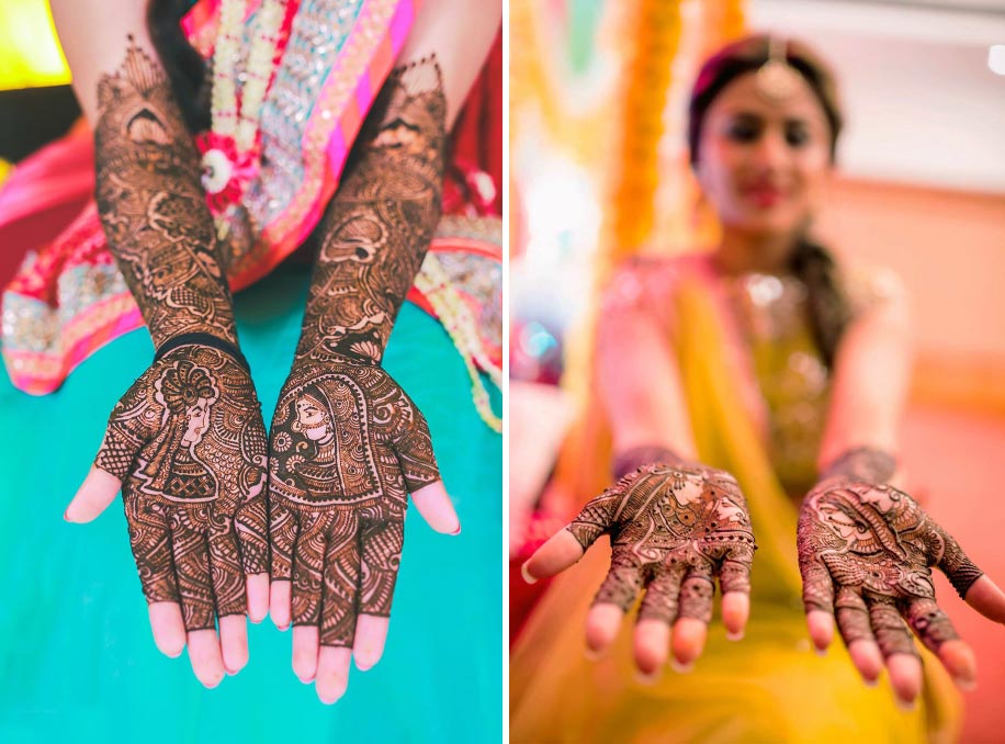 This mehndi pattern is pretty similar to the ‘King & Queen’ design, only this one includes more ‘regular’ portraits of a bride and groom – drawn on the same or separate palms – facing each other.