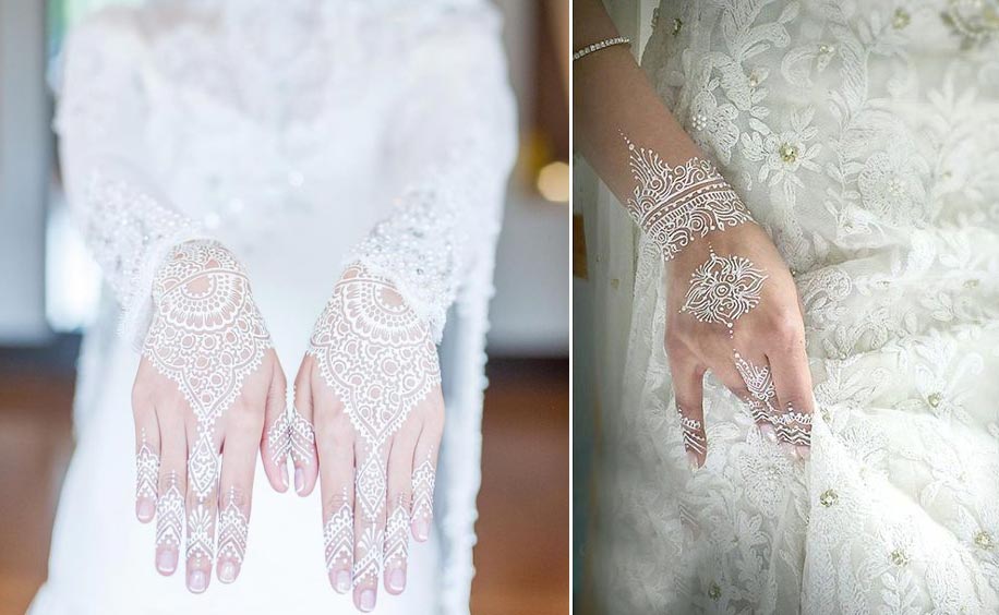 Although this is technically not made from the henna plant/powder, it still borrows from the form and function of traditional bridal mehendi. ‘White mehendi’ patterns have become quite popular recently, and involves the use of body paint or white ink – just remember it doesn’t last as long as the original thing.