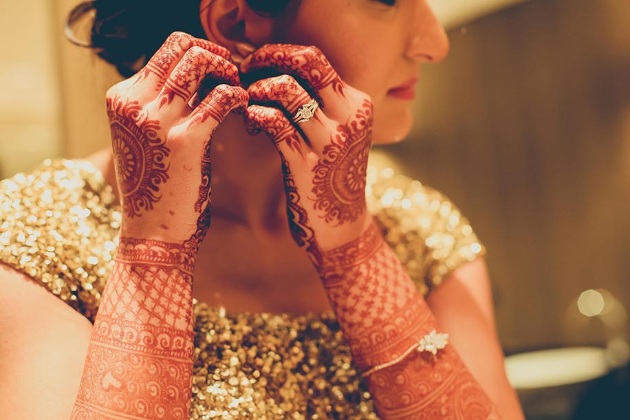 Engagement rings and/or wedding bands are some of the most important accessories for couples. Innovative henna artists can set the stage for highlighting them with mehndi designs on the backs of fingers that replicate the look of rings, make space for real bling or just create a deep contrast against the bright, shiny bands.