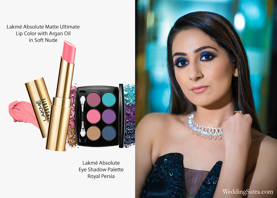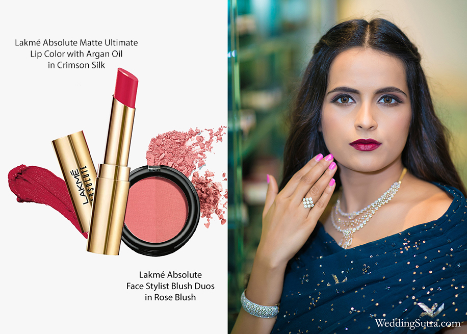 A touch of mystery in a woman is instantly appealing. Here, whether you use a whimsical hint of the color or an intense shot of it, this midnight blue has a depth that is mesmerizing. Recreate this look by using the rich blue pigments from the Lakmé Absolute Eye Shadow Palette Royal Persia on the center of the eyelids, working the edges with a diffused, smoked out effect. With the eyes as the focus of the makeup, Mrudula keeps the rest of the bride’s face understated. The moisturizing formulas of the Lakmé Absolute Matte Ultimate Lip Color with Argan Oil in Soft Nude brings that exact balance with the right amount of unabashed glamor.
