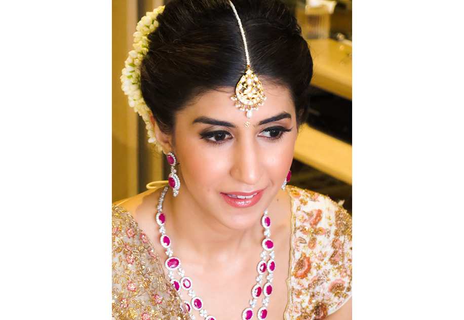 “To match the beauty of the stunning gemstone jewellery Maneka wore, I enhanced her eyes with halo eye makeup which consisted of some glittering eyeshadow and voluminous lashes. I balanced these out with luminous skin and soft coral lips.”