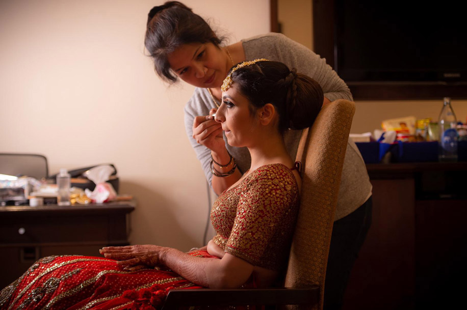 “This blushing bride was given just the right amount of pinkish red to perfectly complement her stunning lehenga. I completed the look by adding a splash of lighter blush to her cheeks which tied the entire look together beautifully.”