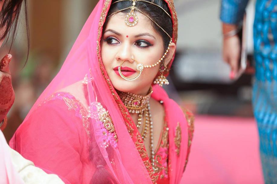 Trust makeup artist Sheena Kohli in Ambala to give you a delicate glamour with a feather-light finish. Nancy Sobti, the bride, is in full bloom with an overall pink palette and subtle contouring in the same tones for an extra bit of oomph.