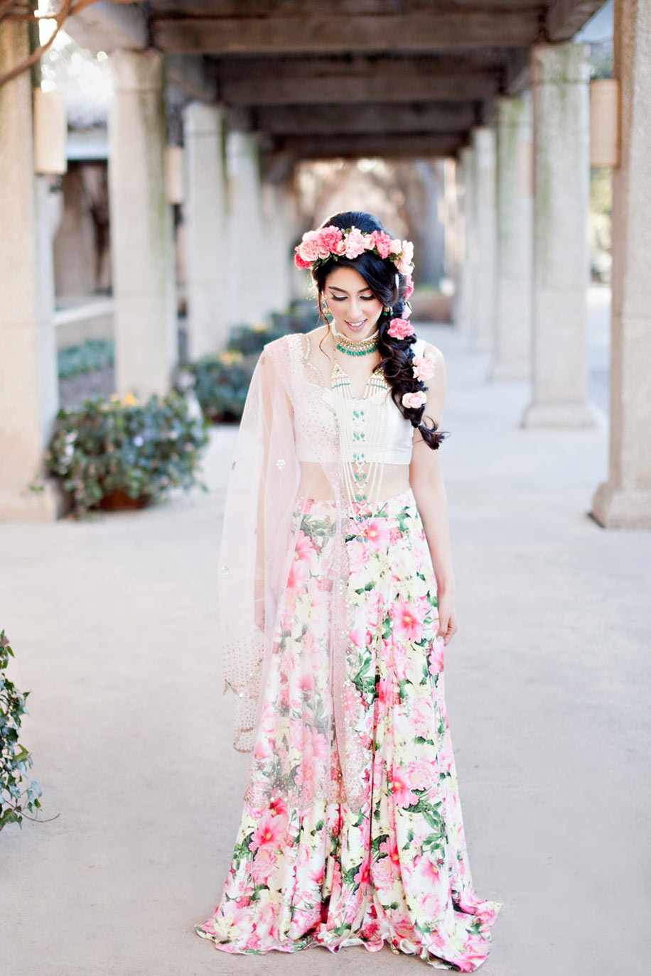 Bride Natasha is a poster girl for boho brides in her pink floral lehenga by BZAI and the stunning floral tiara.