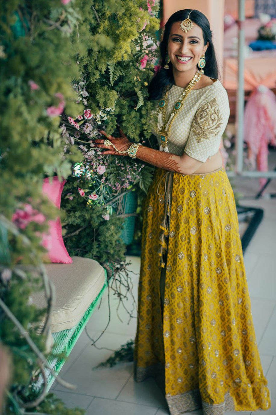 We love bride Bhavika’s edgy twist to her boho Mehndi look with a hand-embroidered blouse and wrap around mustard lehenga paired with an antique gold dhoti.
