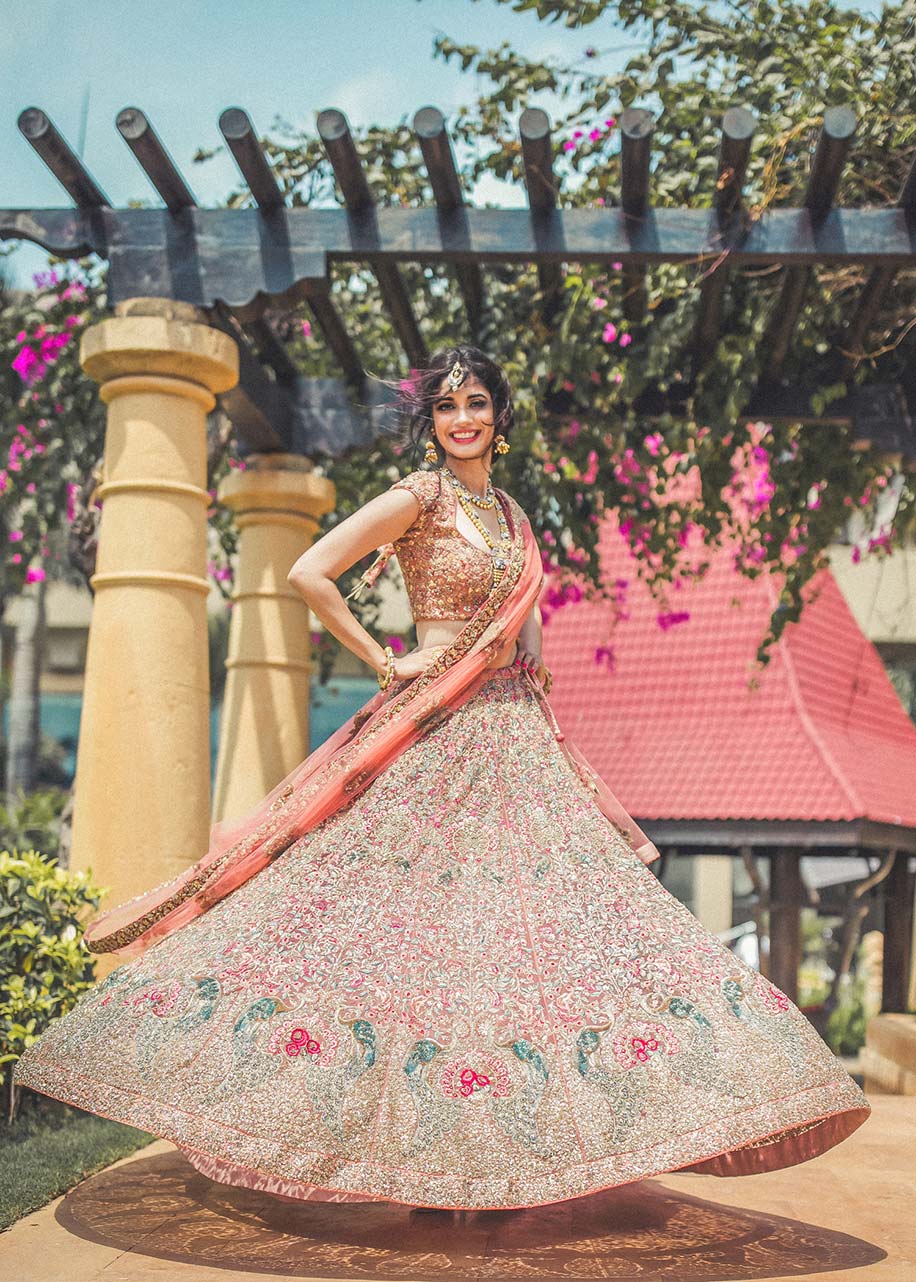 This peach and gold lehenga with gold embroidery and peacock motifs by Shyamal and Bhumika is ideal for a little subdued romance!