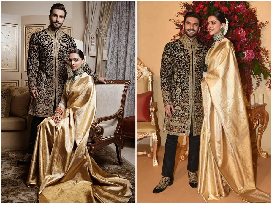 2. Deepika Padukone’s gorgeous red and gold kanjeevaram from Angadi Galleria gifted by her mother for her Konkani wedding made waves on social media. For her Bangalore Reception, she was the epitome of elegance in another dazzling gold saree from Angadi galleria.