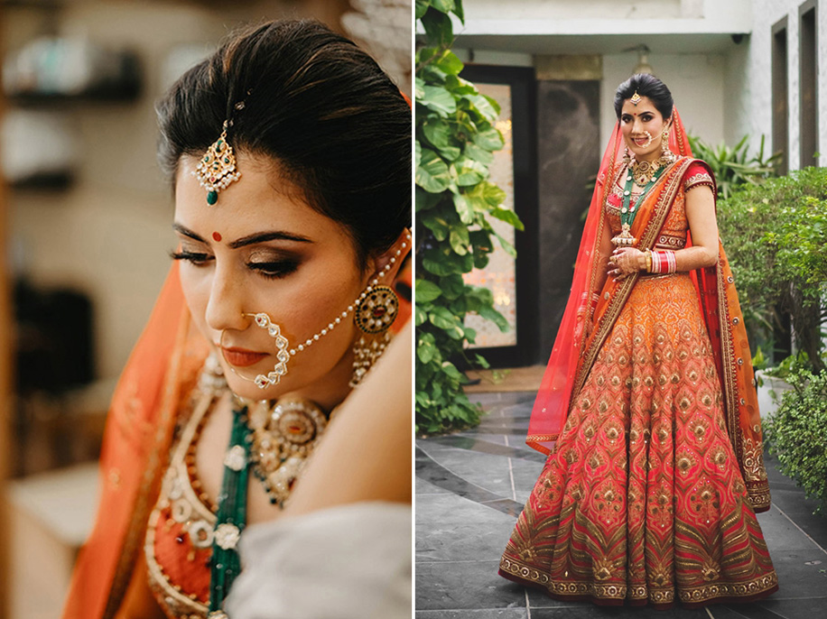 So you can’t choose between orange and red? Wear them both just like Bride Akanksha did. The imperceptible blend between the two shades in this Tarun Tahiliani outfit makes for a wonderful combination. The two-coloured blouse paired with an embroidered orange dupatta and a simple bordered red dupatta creates a warmth that drums up some emotion. The green necklace adds the perfect amount of contrast to the entire look.