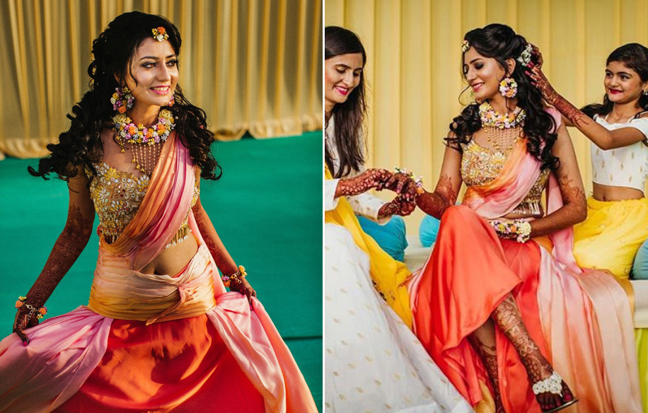 Garbed in a contemporary ombre orange lehenga designed by Dolly J, bride Rutuja basked in the spotlight unhesitantly. Embroidered with dainty gold threadwork, this outfit brings to mind vibrant summer afternoons which makes it perfect for a high-spirited Haldi celebration.