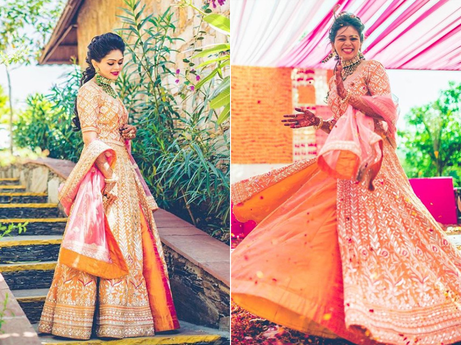 Embroidered with delicate gold threadwork and paired with an elegant, muted beige sequined blouse, this breezy lehenga designed by Abhinav Mishra and worn by bride Vibhuti is ideal for a comfy yet glamorous Mehndi celebration. With curls cascading down her shoulders this bride let nothing stop her from enjoying the golden warmth of the sun.