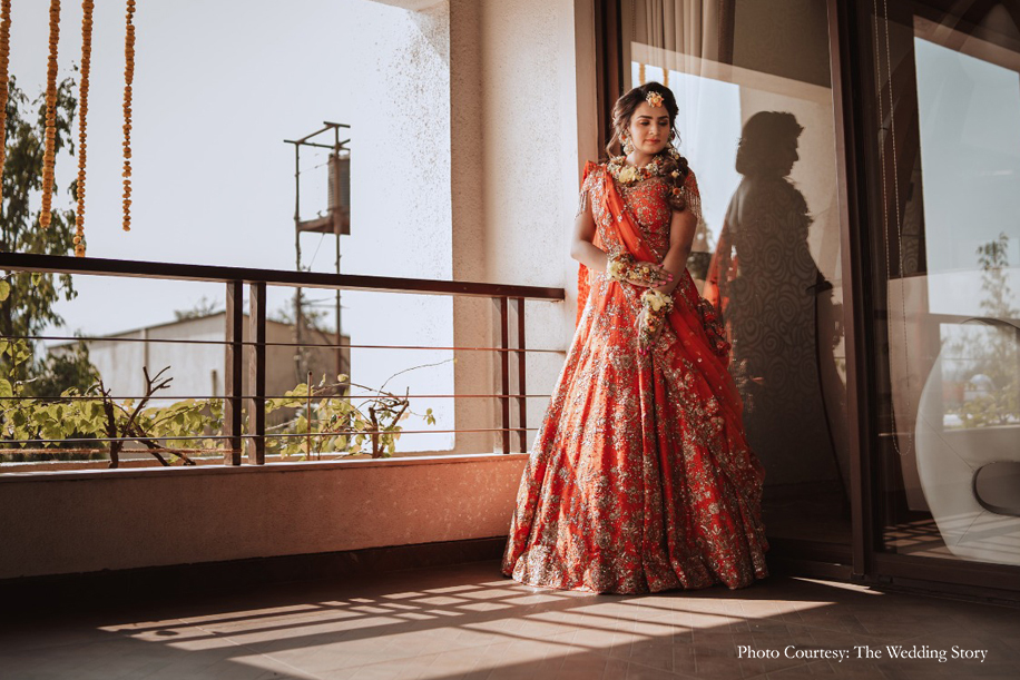 A stunning fusion of cool silver and warm orange, this breezy lehenga designed by Akanksha Gajria and worn by bride Hitika emanates laid-back summer vibes. Lightweight, airy and accessorized with statement jhumkas, it makes a classy statement without overwhelming the senses.