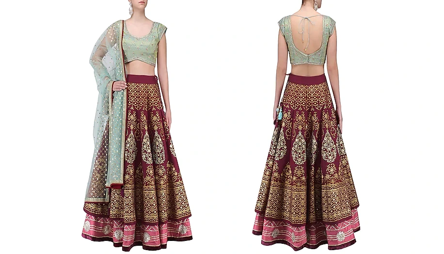Kaia by Garima and Pankaj, Rich wine and aqua embroidered lehenga set