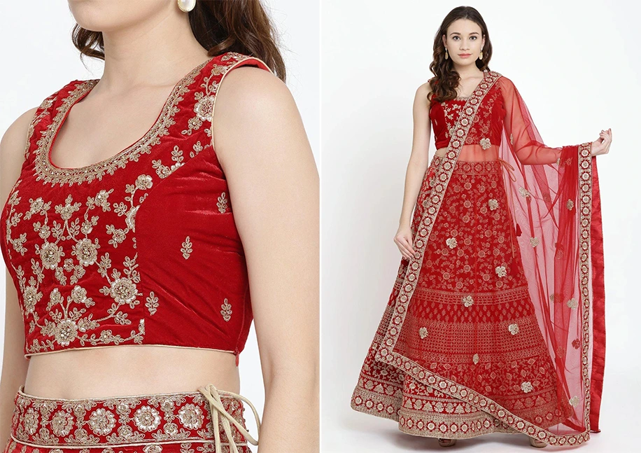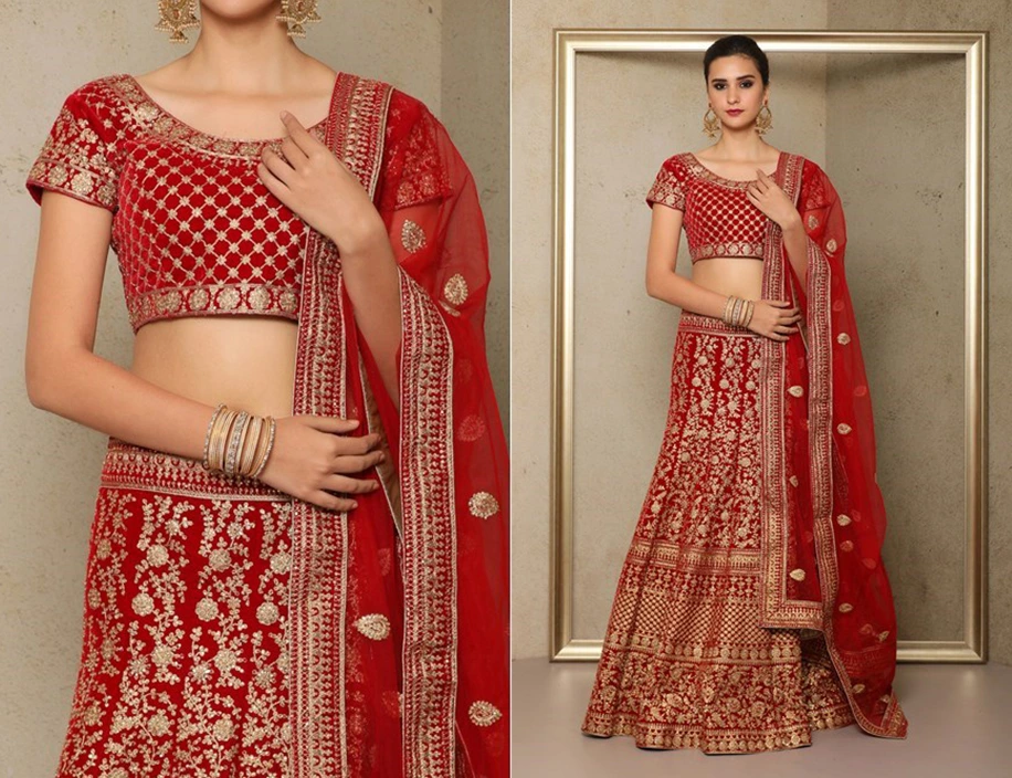 Asopalav, Look royal in this Red velvet gold and peach floral embroidery lehenga