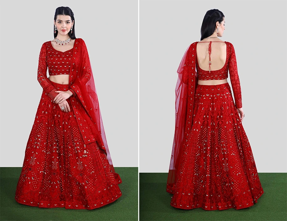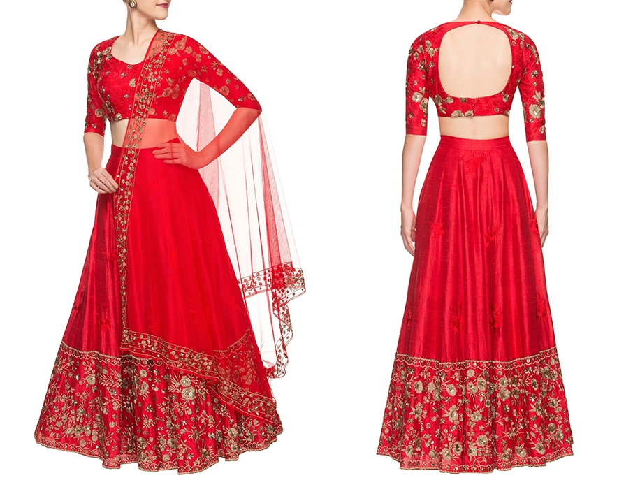 Shyam Narayan Prasad, Warm red zardozi work embroidered lehenga