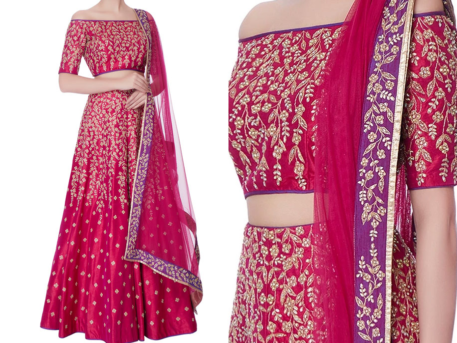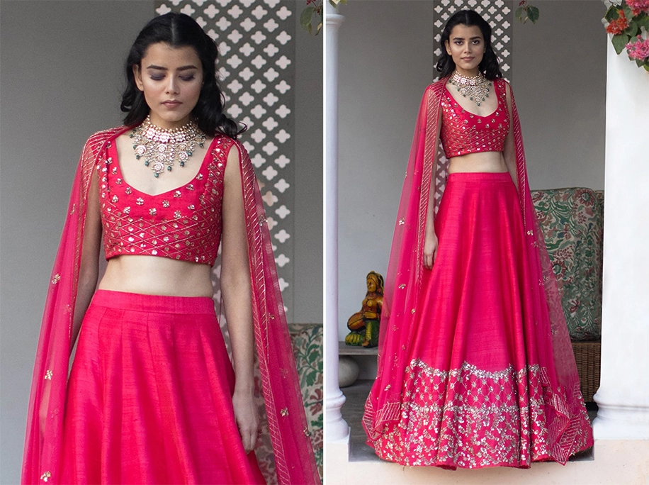 Aastha Narang, Dark pink silk Lehenga with silver floral embellishments