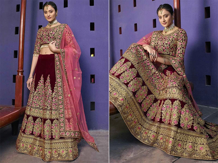 Aishwarya Design Studio, Deep Maroon and pink velvet lehenga set