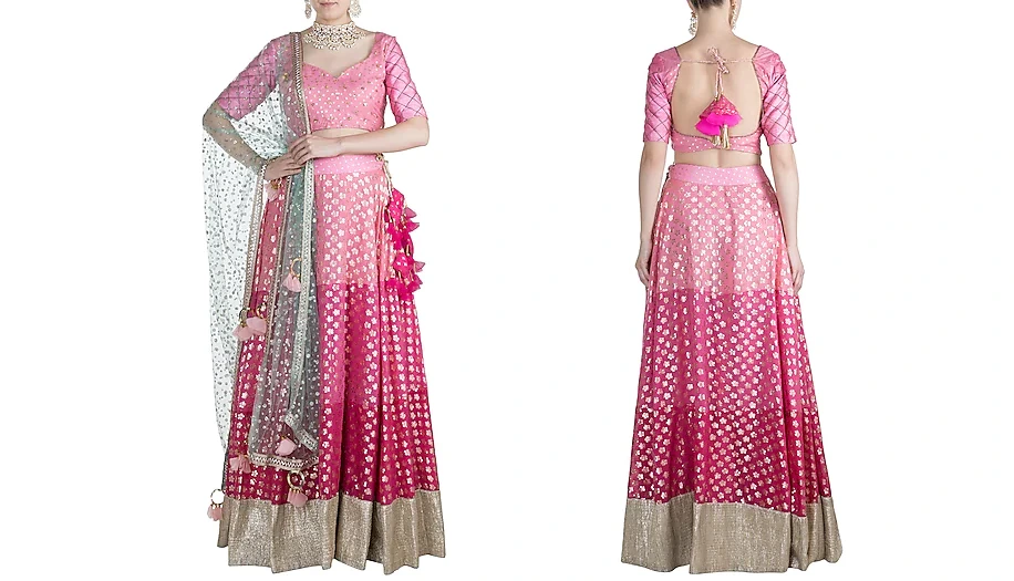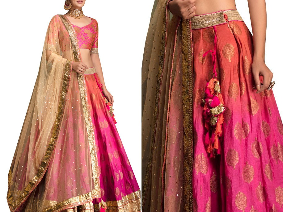 Rishi and Vibhuti, Go boho in this Pink and gold tasseled lehenga