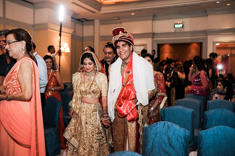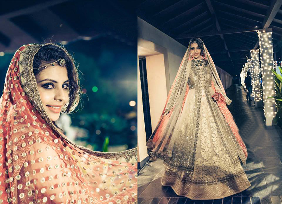 Bride Asma is the epitome of elegance in this gorgeous gold lehenga with a coral net dupatta with intricate design work by Sabyasachi. Pair this with a statement necklace and you’ll look on trend and traditional all at the same time.