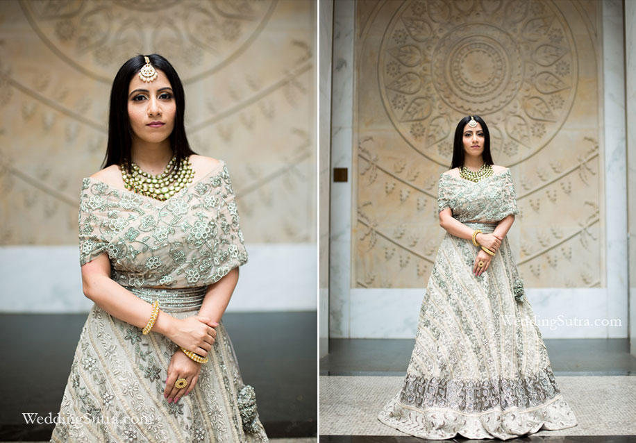 Bride Helly looks majestic in a subtle gold lehenga, covered in ornate embroidery, by JADE. Accessorize a similar ensemble with gold and emerald jewellery to complete the sophisticated look.