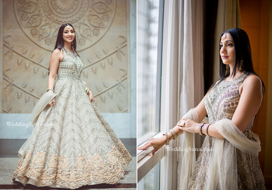 A voluminous gold and ochre net dress like this one by Tarun Tahiliani has an interesting silhouette. Fitted at the top with an asymmetric patterned outer jacket, it can be your ideal sangeet outfit. Accessorize with bespoke gold jewellery and minimal makeup to make a statement at your sangeet.