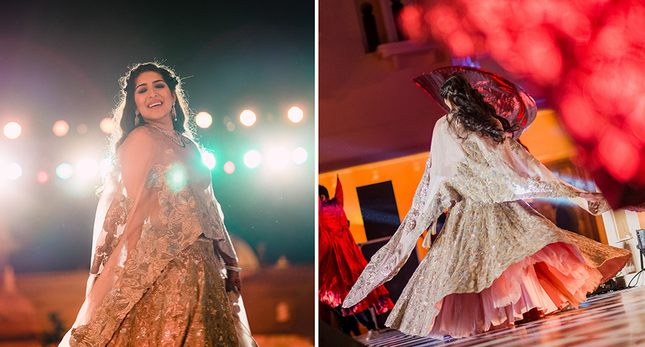 Bride Jasmina set off sparkles in a sequined lehenga by Sabyasachi Mukherjee for her pheras in Spain. She added to the glimmer with diamond and emerald jewellery.