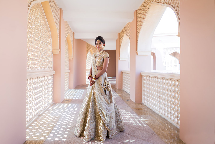 Bride Sasha evoked sunrise on the dunes in her dreamy gold and sand-colored lehenga at her pheras in Muscat. She accessorized with a gold and sapphire kundan necklace and a quintessential maang tika and looked like something out of the Arabian Nights.