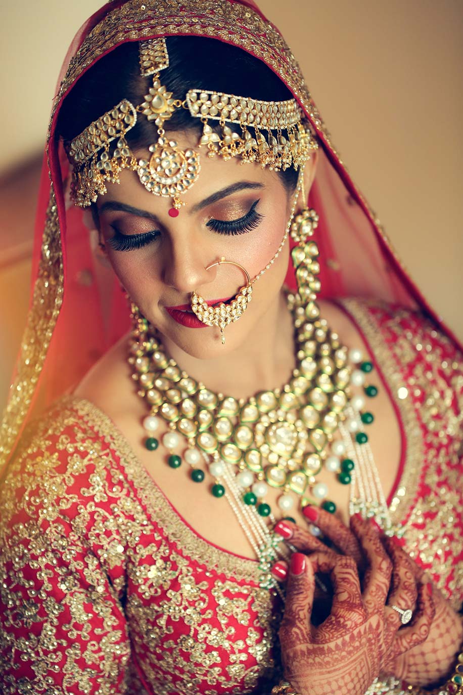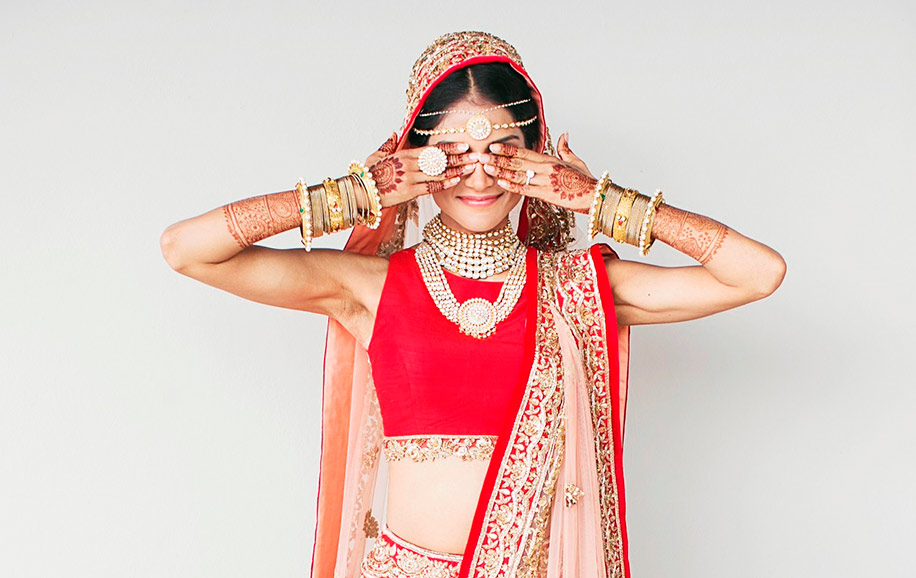 A little creativity and a whole lot of pretty – bride, Dipti takes her love for the traditional bindiya to the next level of cool by combining a delicate borla inspired gold matha patti to match with her stunning red bridal lehenga.