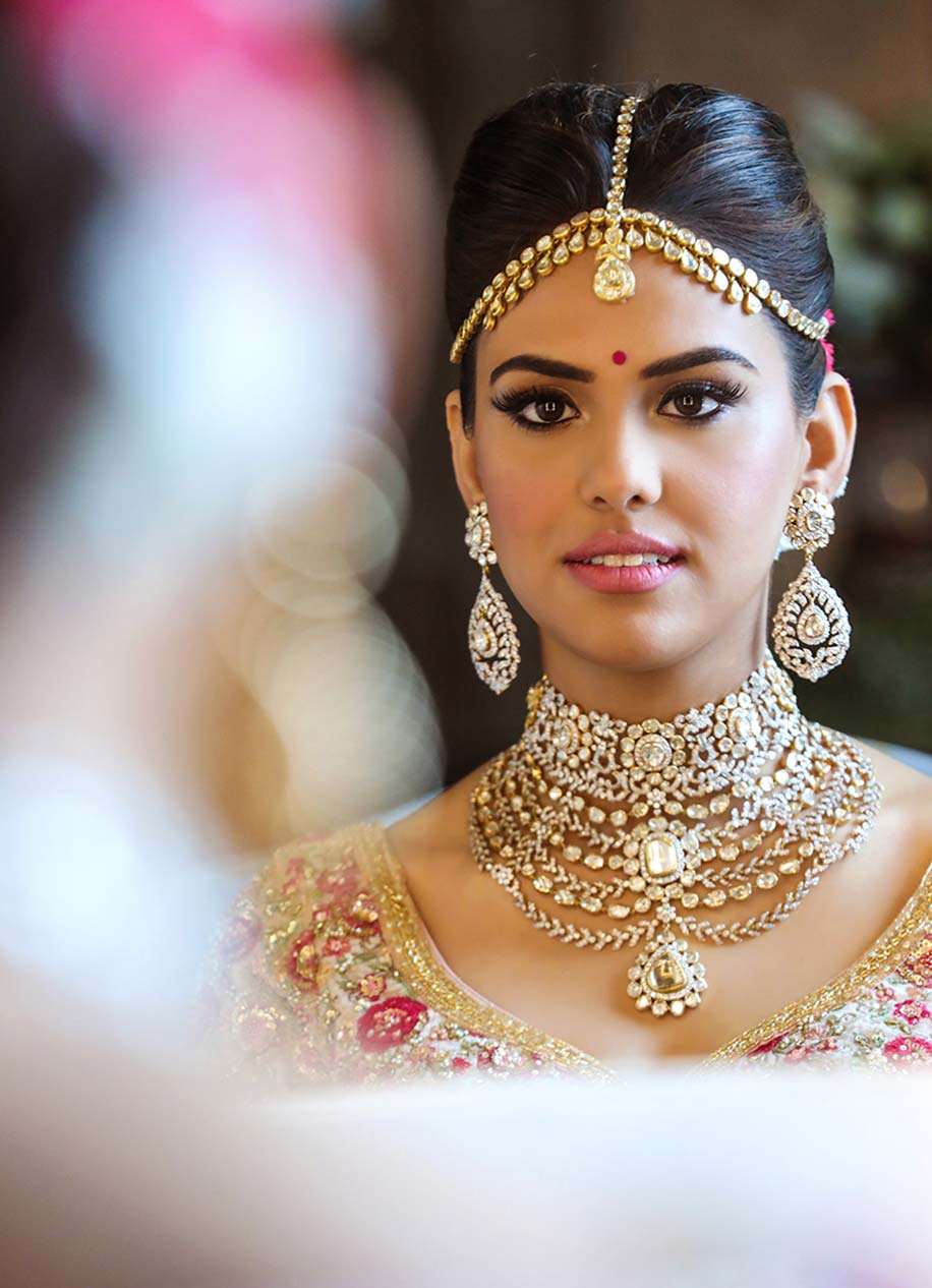 Bride Neha is an absolute royal dream in this ornate gold matha patti complete with delicate kundan work which is ‘very’ wedding and reception function appropriate!