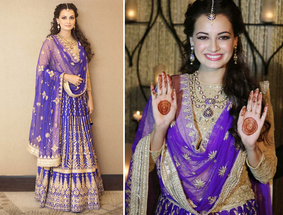 3. Dia Mirza in a beautiful violet lehenga at her sangeet