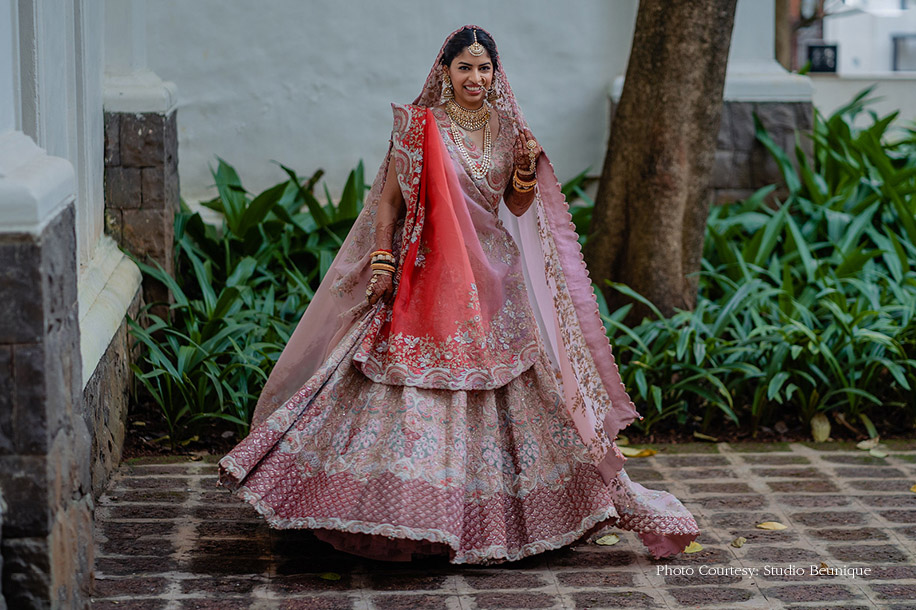 Prachee looked every bit the quintessential princess in this dreamy pink lehenga on her big day.