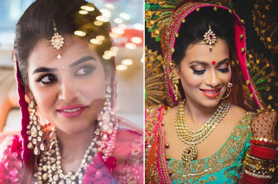 Slightly more opulent than the single-string, this double-strand sits across the bride’s forehead and looks regal with its pearl and stone ornamentation.