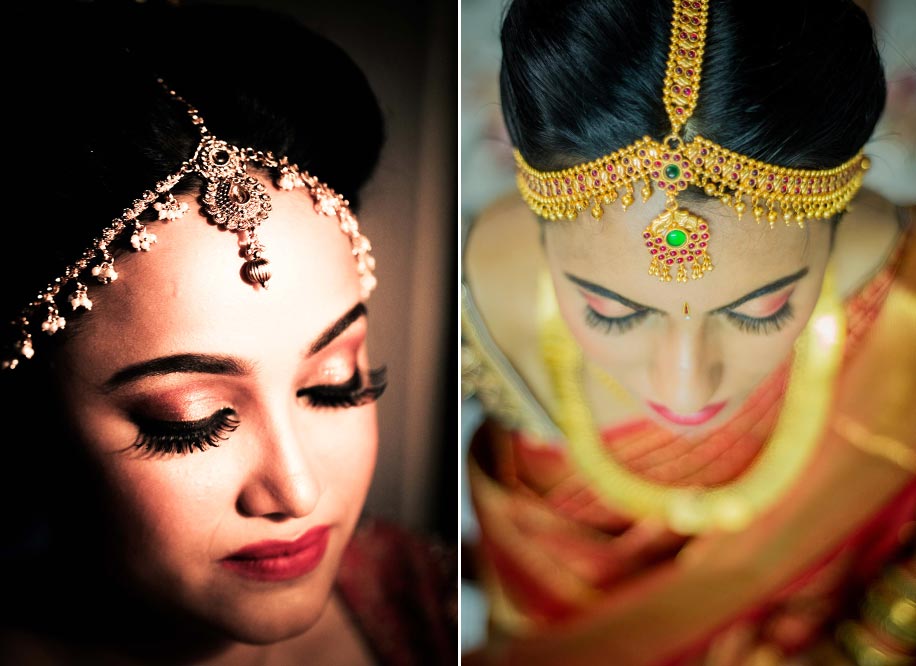 The traditional South Indian maatha pattis are a mesmerizing combination of red and green stones and pearls. Elaborate and intricate, they enhance the bridal ensemble.