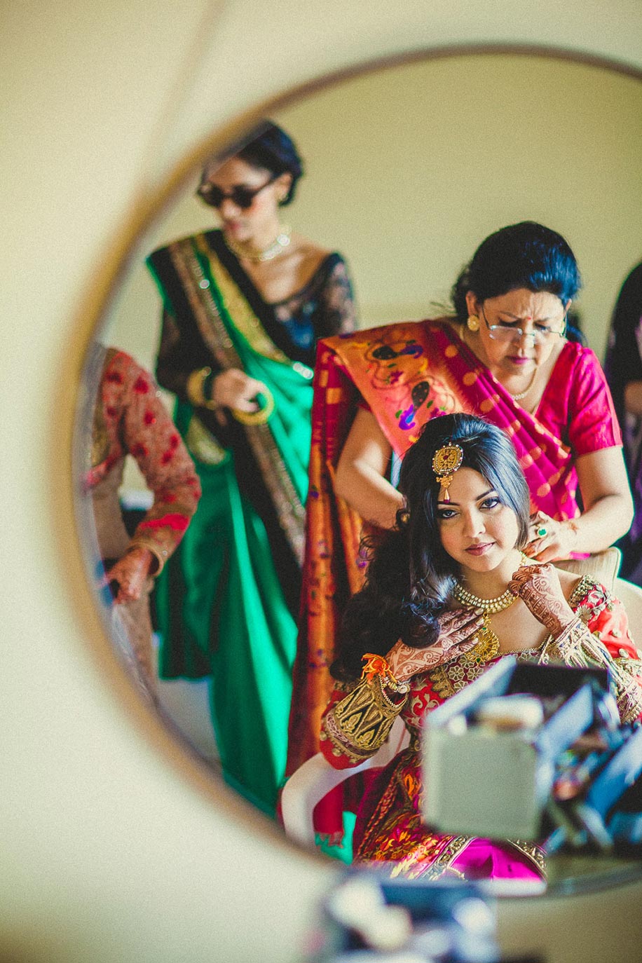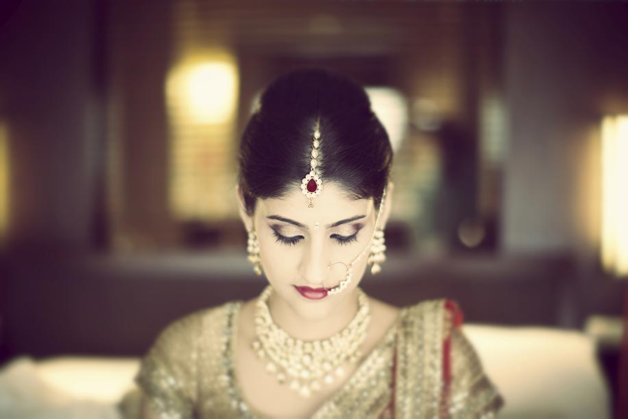 Worn higher than usual, just kissing the hairline, this matha patti frames the bride’s face and draws attention to her eyes and facial features.