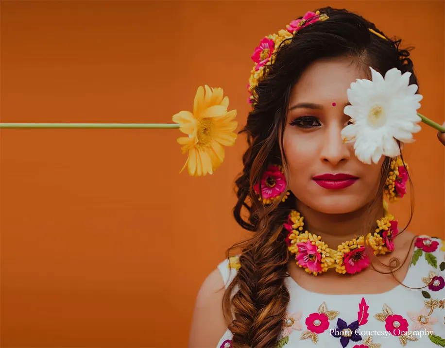 Can’t decide between traditional flower accessories or an artistically crafted hairstyle? Choose both like Akanksha!