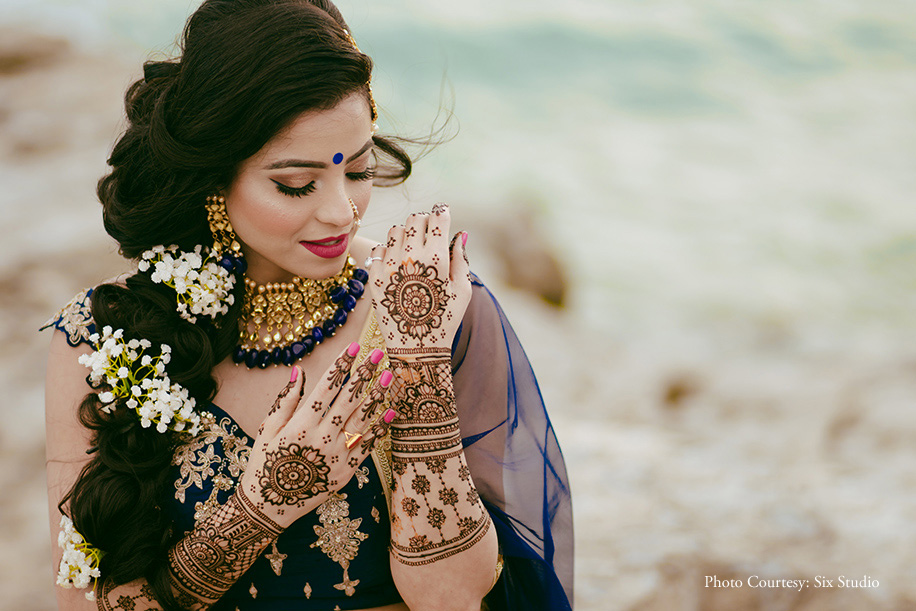 Jasryn gave boho waves an elegant updo with this fresh side-swept look for her mehndi soiree.
