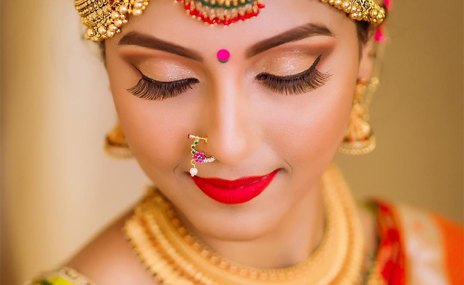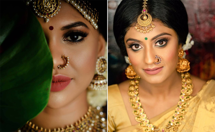 An ornate nose ring studded with precious gems or pearls and forged with gold, the mukkuthi golimmers on the bride’s nostril.