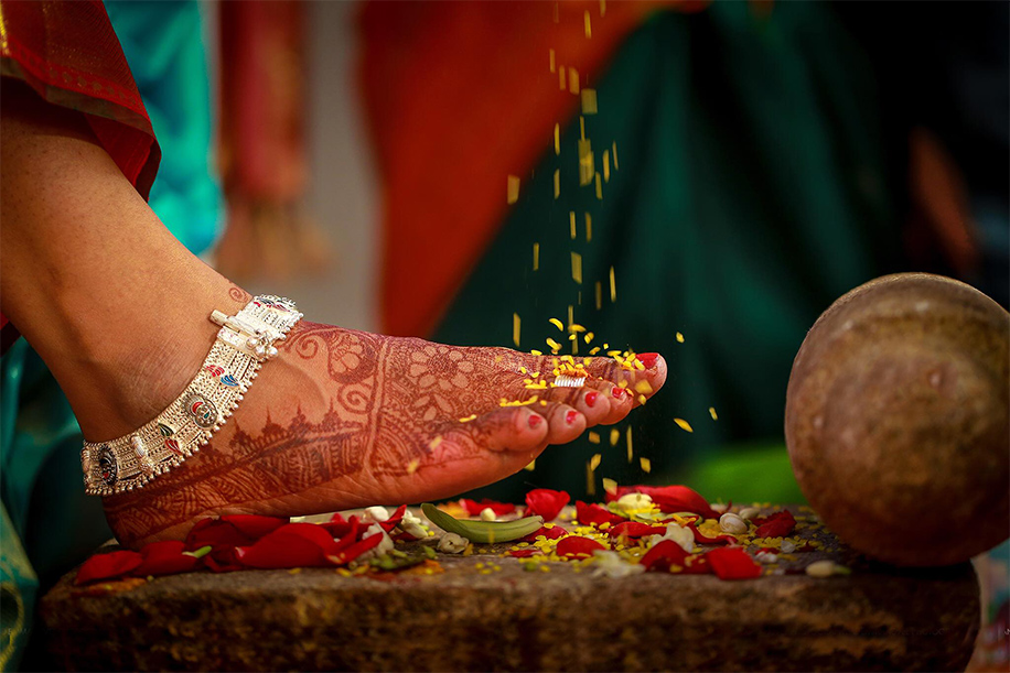 A traditional hair accessory, the jagadanam adorns the bride’s plait and is crafted out of gold and colorful flowers.