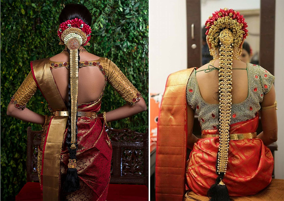 The signature south Indian hair accessory, the jagadanam adorns the bride’s plait and is crafted out of gold with intricate designs.
