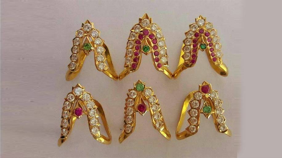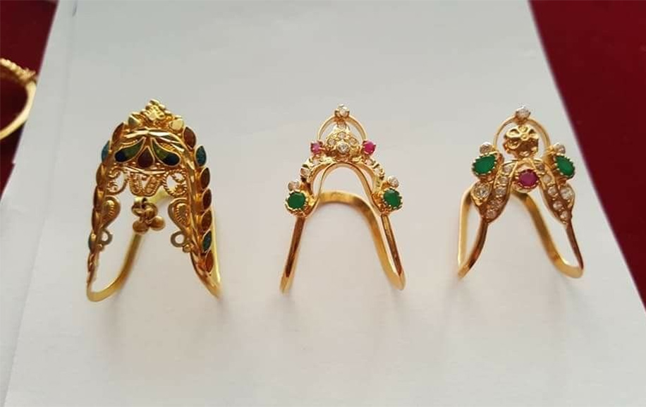 Traditionally designed finger rings that are studded with a variety of gems, the kempu kal mothiram are crafted to glimmer on a bride’s fingers.