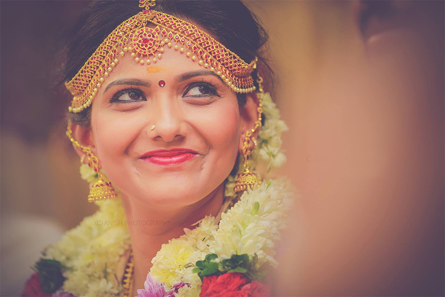 A unique matha patti, the netri pattai is a slender band of beads tied around the bride’s forehead that highlights her eyes.